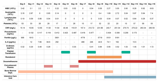 The myeloablative conditioning consisted of BuCyE (busulfan 3.2 mg/kg; cyclophosphamide 50 mg/kg; etoposide 200 mg/m2). On the day -1, the patient presented fever, non-productive dry cough and general malaise. Oxygen saturation was normal. Physical examination revealed no evidence of lower respiratory tract involvement. Testing for viral infections was performed and SARS-CoV-2 RT-PCR came back positive. Supportive therapy was the only treatment at that point. The HSCT was performed on day “0” with a total of 12.1 × 106 CD34+/kg bw cells infused. A gradual increase of IL-6 concentration was observed, from 12.00 pg/mL on day +1 to 488.00 pg/mL on day +6. This was accompanied by an increase of ferritin and CRP level, to 5719 µg/L and 280 mg/L, respectively. Procalcitonin levels were consistently low (Figure 2).