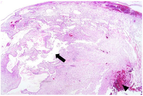 Lower magnification shows a well-defined and capsulated round mass with intratumoral cystic changes (arrow) and hemorrhage (arrowhead) (H-E stain, 20× magnification).