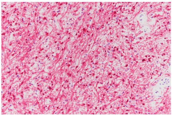 The immunohistochemical study shows diffuse strong-positive signaling for the S-100 protein (200× magnification).