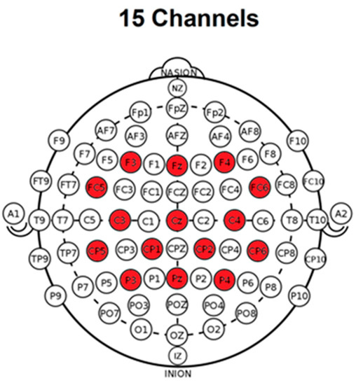 Before the actual VR training, the acquisition of the EEG will be carried out. An experienced technician will acquire EEG through a BCIs system with 64 active electrodes equipped with a low-noise biosignal amplifier and a 24 bit A/D converter at 256 Hz (BrainVision actiCHamp biosignal amplifier, Brain Products GmbH, Gilching, Germany). The spatial distribution of the electrodes will cover primarily the motor and somatosensory areas of the brain. Specifically, the Frontal (F3, Fz, F4), Frontal-Central (FC5, FC6), Central (C3, Cz, C4), Central-Parietal (CP5, CP1, CP2, CP6), and Parietal (P3, Pz, P4) in a small Laplacian configuration for spatial filtering (Figure 1). EEG data acquisition and processing will be performed through the OpenVibe platform [42], which will transmit the data via the Lab Streaming Layer (LSL) protocol to control the virtual environment.