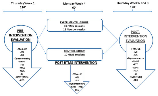 Schematic representation of intervention protocol. It includes the days of the week and duration of each block of outcomes measurement in pre- and post-evaluation (FMA-UE—Fugl-Meyer Assessment for upper extremity; MI—Motricity Index; SIS—Stroke Impact Scale; RMT—Resting Motor Threshold; NHPT—Nine Hole Peg Test; FTT—Finger Tapping Task; MAS—Modified Asworth Scale; NSA—Nottingham Sensory Assessment; BI—Barthel Index; EEG—Electroencephalogram. Thursday/90–120 min; Monday/60 min; Control Intervention/Monday to Friday/10 rTMS sessions and Experimental Intervention: Monday to Friday/10 rTMS sessions and Monday, Wednesday, and Friday/12 NeuRow sessions).
