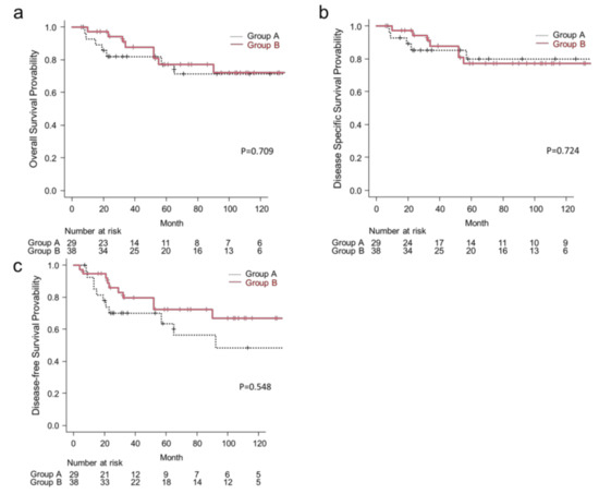 Kaplan–Meier curves of Group A and Group B ((a) OS; (b) DSS; (c) DFS). OS, overall survival; DSS, disease-specific survival; DFS, disease-free survival.