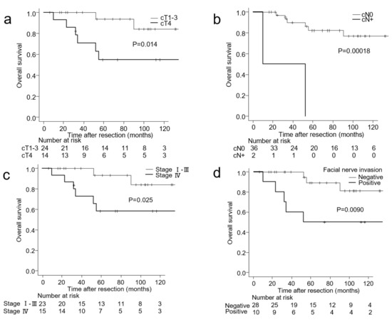 Kaplan–Meier curves of OS of Group B stratified by (a) clinical T stage, (b) clinical N stage, (c) disease stage, and (d) intraoperative facial nerve invasion.