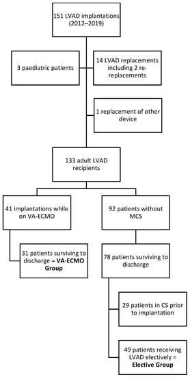 A retrospective analysis of our institutional database was performed to identify all LVAD implantations in adult patients over the 8-year period between 1 January 2012 and 31 December 2019. Each case was analysed in terms of MCS before surgery. Patients who received a replacement of the LVAD or other cardiac circulatory support device were excluded from further analysis after the second operation. Furthermore, urgent LVAD implantations with inotropic support but without MCS before surgery, post-cardiotomy CS and LVAD implantations in paediatric patients were excluded. We finally categorised patients into either a ‘VA-ECMO’ or ‘elective’ group, according to urgency of LVAD implantation.