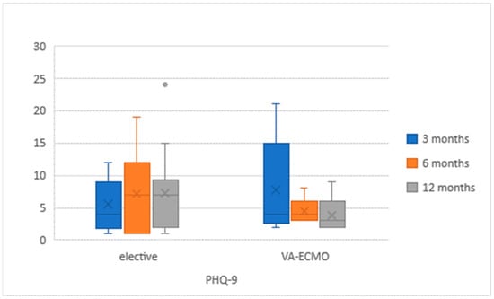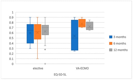 QoL questionnaires were correctly completed by 39 (48.8%) participants (Figure 2 and Figure 3). The questionnaires were completed by a group of 18 (58.1%) VA-ECMO patients and by 21 (42.9%) patients. Both cohorts did not differ significantly, and the characteristics were similar to these mentioned in Table 1 in terms of demographics and aetiology. In the VA-ECMO cohort, the initial EQ-5D-5L score had improved from 59% (+/−23) after 3 months to 66% (+/−12) after 12 months. In the elective cohort, a similar increase from 58% (+/−12) to 62% (+/−21) was observed. The PHQ-9 score in the VA-ECMO population decreased from an initial 7.2 (+/−6.8) to 5.8 (+/−5.1). In the elective population, the same score increased from 5.8 (+/−4) after 3 months to 7.2 (+/−6.2) after 12 months. There were no significant differences in QoL between both groups of patients at any time of the study (Table 2).