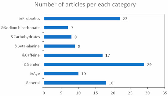 Number of articles used based on the category: sport- general aspects, sport & age, sport & gender, sport & caffeine administration, sport & beta-alanine administration, sport & carbohydrates consumption, sport & sodium bicarbonate administration and sport & probiotics administration.