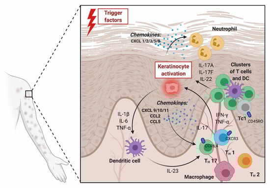 Presence of chemokines in the pathogenesis of psoriasis. Abbreviations: CCL—chemokine C-C motif ligand; CCR—chemokine C-C motif receptor; CXCL—C-X-C motif chemokine ligand; CXCR—C-X-C motif chemokine receptor; DC—dendritic cell; Th1—T helper 1 lymphocyte; Th17—T helper 17 lymphocyte; Th2—T helper 2 lymphocyte; IL—interleukin; IFN-γ—interferon gamma; TNF-α—tumor necrosis factor alpha. Own design based on [,]; figure created with BioRender.com.