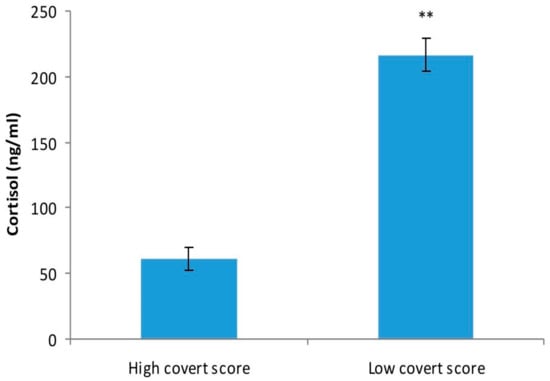 Thus, the differences between individuals with high covert aggression (who scored more than 10 on OCAI) (n = 14) versus individuals with low levels of covert aggression (with a score of maximum 10 points on OCAI) (n = 14) concerning the levels of oxytocin and cortisol were statistically analyzed.