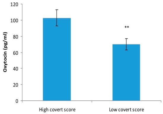 On the other hand, oxytocin level was significantly higher in patients with a higher score on covert type of aggression (102.87 ± 39.26 pg/mL) compared with patients with a lower score on the covert subscale of OCAI scale (70.01 ± 25.07 pg/mL) (