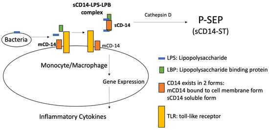 P-SEP is the subtype of the soluble form of CD14 (sCD14-ST); more precisely, P-SEP is the 13 KDa N-terminal fragment of soluble form of CD14 (sCD14), cleaved by cathepsin D in plasma, and involved in activating the innate immune system. [27]. Especially in the last decade, several studies have shown increases in response to bacterial infections and decreases after healing or effective treatment [6,14], so that P-SEP is considered a new biomarker, effective in early recognition of different types of infections [28,29]. As known, infections activate the host’s immune system, usually distinguished into innate and an adaptive: while adaptive needs several days to be effective, an innate system provides an immediate response mainly through the alternative complement system and phagocytosis [30,31,32]. Both systems need to recognize the pathogens, but the innate one carries out recognition through different receptors, that are already predetermined, placed on the immune effector cell surface [33,34], able to recognizing a wide range of antigens on the surface of most microbial pathogens [35]. CD14 is 55 KDa transmembrane glycoprotein acting as a coreceptor, placed on the monocytes and macrophages cell surface, belonging to the family of Toll-like receptors (TLRs), which play a role in the identification of several Gram-positive and Gram-negative bacterial ligands [31,36]. In particular, the recognition of Lipopolysaccharide (LPS), present on the Gram-negative bacteria surface, requires the association of the Lipoprotein Binding Protein (LBP), which presents the LPS at CD14; the CD14-LPS-LBP complex stimulates intra-cellular signals that promote the expression of genes involved in the immune response such as cytokines production by effector cells [37]. CD14 exists in two forms: one bound to the membrane (mCD14) of monocyte and macrophage cells, and a soluble one (sCD14) present in the plasma, where it is cleaved by cathepsin D into a fragment of 13 kDa (sCD14-ST), precisely named, released in the general circulation by proteolysis and exocytosis [13,37] (Figure 1).