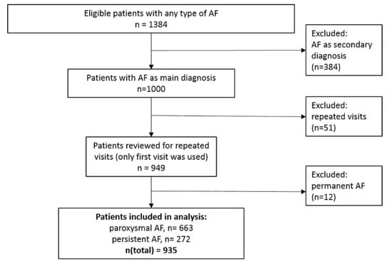 A total of 1384 subjects were recruited between October 2014 and April 2017. Patients were selected based on their primary admission diagnosis: we included patients with recent-onset AF as a primary diagnosis and excluded patients with AF as secondary diagnosis, as well as patients with long-standing AF. For those with repeated visits we used only the first visit (Figure 1). This resulted in a total of 935 patients for the present analysis.