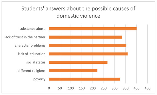 Regarding the students’ answers about the possible causes of domestic violence, they considered them being as follows: poverty, 323 (77.8%); different religions, 221 (53.3%); social status, 267 (64.3%); lack of education, 359 (86.5%); character problems, 353 (85.1%); lack of trust in the partner, 333 (80.2%); substance abuse, 400 (96.4%). See Figure 1 for details.