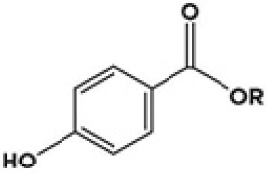 Parabens are a category of preservatives that is widely used in ointments, cosmetics, creams, lotions, dentifrices, toiletries, foods, and local anesthetics to inhibit the growth of microbes [27]. They are alkyl esters (methyl, ethyl, propyl, or butyl) of p-hydroxybenzoic acid, a chemical compound present in many fruits and plants that occurs naturally [28]. Its phenol-like activity, which probably works by protein denaturation and the antimetabolite properties of p-hydroxybenzoic acid, has shown bacteriostatic, fungistatic, and oxidant properties [29]. Chemical structures (Figure 2) and actions of the commonly used parabens are very similar, with the “R” group changing as shown in Table 2. The most widely used parabens are methylparaben, ethylparaben, propylparaben, and butylparaben, while many parabens (isopropyl-, isobutyl-, pentyl-, phenyl-, benzyl-) have been used, too.