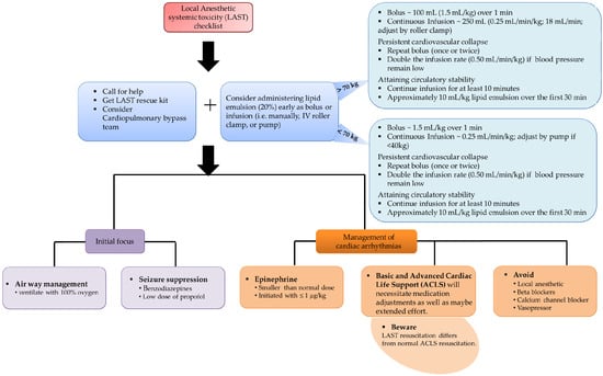The introduction of lipid emulsions reduces the plasma concentration of free accessible LA, which is the other premise of treatment. The infusion of lipid emulsions binds free circulating local anesthetics and lowers plasma levels due to their high lipid solubility. The American Society of Regional Anesthesia and Pain Medicine (ASRA) publish its management recommendations concerning LAST on a regular basis to reflect new information, user input, and simulation [58,59,60,61,62]. Figure 3 reflects a part of a clinical system for managing LAST suggested by the American Society of Regional Anesthesia and Pain Medicine (ASRAPM).