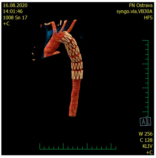 CT 3D reconstruction of the aortic arch with the implanted aortic stent-graft.