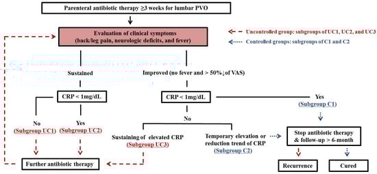 It is still difficult to determine when to discontinue antibiotic therapy due to inconsistencies in clinical symptoms and blood inflammatory markers in PVO. Thus, there are no clear guidelines for determining therapeutic response. Generally, CRP is more strongly associated with clinical symptoms compared to ESR and WBC count, which decreases quickly in the patients presenting with clinical improvement []. Especially, WBC count is proved to be less indicative of the diagnosis and treatment response and produces false negatives in cases of elderly or immunosuppressed patients [,]. Given these findings, we designed a PVO flowchart for the clinical assessment of therapeutic response using clinical symptoms and CRP level based on the literature and our clinical experiences. The proposed minimum duration of parenteral antibiotic therapy for PVO is 2–4 weeks [,,]. In our study, the minimum required duration of parenteral antibiotic therapy for clinical assessment was determined to three weeks based on previous studies recommending short treatment duration [,]. Finally, clinical assessment of therapeutic response was performed based on clinical symptoms and CRP level after at least three weeks of parenteral antibiotic therapy. Recently, the efficacy of oral antibiotics as the first-line therapy has been reported; however, our study used parenteral antibiotics, as the evidence for the efficacy of oral antibiotics is still insufficient, and there are higher rates of antibiotic resistance. Furthermore, we considered that high-bioavailability oral antibiotics are not available under our national health-insurance system.