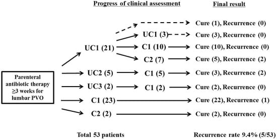Fifty-three patients underwent total 80 rounds of clinical assessment based on PVO-flowchart with simultaneous 18F-FDG-PET/MRI during parenteral antibiotic therapy. The decisions were divided into subgroups UC1, UC2, and UC3 of the group UC and subgroups C1 and C2 of group C. Parenteral antibiotic therapy was discontinued in 25 patients with the decision of subgroups C1 (n = 23) and C2 (n = 2), while the remaining 28 patients underwent additional clinical assessments of therapeutic response during parenteral antibiotic therapy. Four patients of subgroup UC1 were cured after further antibiotic therapy and clinical assessment without performing simultaneous 18F-FDG-PET/MRI. Five recurrences were identified in three of subgroup C1 and two of subgroup C2. Details are presented in Figure 2.