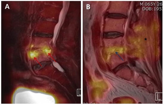 In the assessment of therapeutic response in spine infection, the attempts to apply 18F-fluorodeoxyglucose positron emission tomography (18F-FDG-PET) have been going on for 10 years, and detailed research results have been reported [,]. 18F-FDG-PET is considered to be less affected by other conditions than blood inflammatory markers []. The change of the intensity of FDG uptake presented as a maximum standardized uptake value (SUVmax) between before and after antibiotic therapy was considered a useful method for therapeutic response [,]. Recently, Jeon et al. [] reported that 18F-FDG-PET had higher diagnostic accuracy than CRP and MRI for detecting residual PVO using the intensity of FDG uptake. Furthermore, they emphasized the increase of diagnostic accuracy for detecting residual PVO using 18F-FDG-PET and CRP together. In addition, the clinical and radiological characteristics according to anatomical location of major structural damage were analyzed in patients with cured PVO, which was expected to be very helpful for determining therapeutic response in clinical field [].