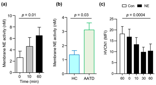 NE activity on AATD neutrophil membranes cleaves HVCN1. (a) Significantly increased NE activity on healthy control (HC) neutrophil plasma membranes after TNF-α (10 ng)/fMLP (10 μM) stimulation (n = 5 biological repeats, as measured by FRET assay (p = 0.01, one-way ANOVA, post hoc Bonferroni test)). (b) Activity of NE on unstimulated HC or AATD neutrophil plasma membranes. AATD neutrophils exhibit significantly increased activity of NE compared to HC (n = 3 subjects per group, p = 0.03, Student’s t test). (c) HC neutrophils (2 × 106) were untreated (Con) or exposed to NE (20 nM) over a 60 min time course. Exposure to NE significantly reduced membrane expression of HVCN1 after 60 min (p = 0.0004, n = 5, one-way ANOVA, post hoc Dunnetts’ test).