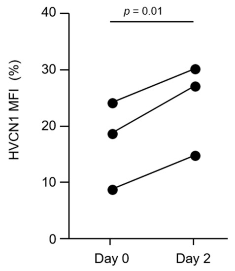 We have demonstrated that AATD neutrophils have increased plasma membrane NE activity, which can cleave HVCN1 from the neutrophil surface. To further validate this point, we explored the impact of AAT augmentation therapy administered intravenously each week [31]. Patients with AATD receiving IV AAT replacement therapy were recruited. AATD patients had a blood sample drawn on day 0 (on the day of their infusion, immediately prior to administration) and a second blood sample on day 2, after infusion. This is similar timing of sample collection as previously described [32,42]. Results demonstrate that membrane HVCN1 on AATD neutrophils significantly increased by 40% on day 2, compared to day 0 (p = 0.01) (Figure 4). IV replacement therapy has previously been shown to increase plasma levels of AAT to HC levels [33], and to reduce membrane serine protease activity [25,29]. In the current study, we extend these observations and demonstrate that AAT therapy increased plasma membrane levels of HVCN1, a crucial H+ transporter linked to neutrophil activity.