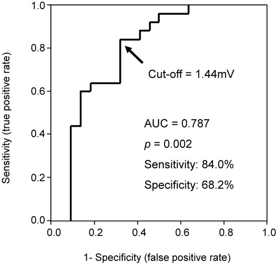Logistic regression analyses were performed to investigate the predictors of CRT responders among baseline variables, including ECG parameters. Multivariate analyses were performed for those with p < 0.05 in the univariate analyses. Receiver-operating characteristics analysis was performed to calculate a cutoff of continuous variables to predict CRT responders.