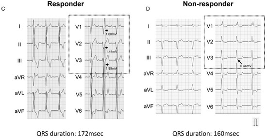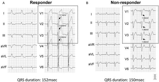 Guidelines [1,2,3] state that cardiac resynchronization therapy (CRT) improves clinical outcomes in strictly selected heart failure patients, particularly those with left bundle branch block (LBBB). Previous studies suggested several baseline characteristics, including PR interval, QRS duration, and QRS axis in surface electrocardiogram, as additional predictors of favorable responses to CRT, accompanying cardiac reverse remodeling and greater clinical outcomes [4,5,6,7]. Of note, a multicenter study recently demonstrated that a decrease in QRS amplitude at lead V1 after CRT implantation could predict favorable outcomes [8]. Nevertheless, various indices, including guidelines criteria, cannot satisfactory discriminate responders to CRT, and further studies are warranted to propose an optimal index to predict responders to CRT.