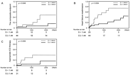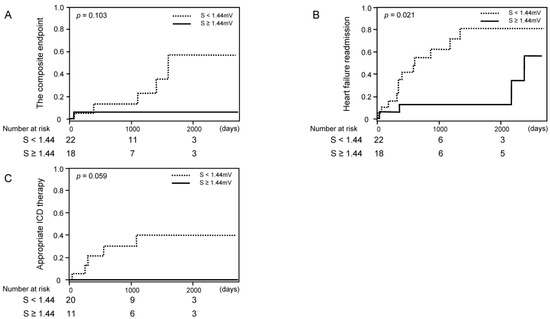 Cumulative incidence of clinical events stratified by the cutoff of S-wave amplitude among those without left bundle branch block ((A) the composite endpoint of cardiovascular death, a heart transplantation, or a left ventricular assist device implantation; (B) heart failure readmission; (C) appropriate ICD therapy).