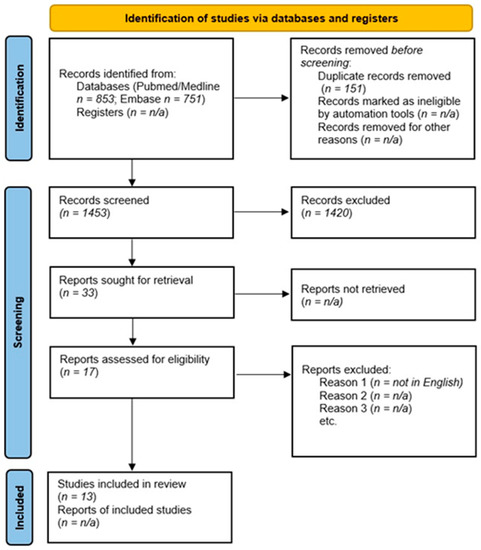 A total of 1453 articles (PubMed/Medline = 853; Embase = 751) was found after excluding duplicates (n = 151), leading to the selection of 33 articles with an abstract and/or title pertinent to our research (Figure 1). After assessing the corresponding full article, we selected 13 papers to be included in this review. One article was excluded because it was not written in English. A summary of the findings of the included studies is provided in Table 1.