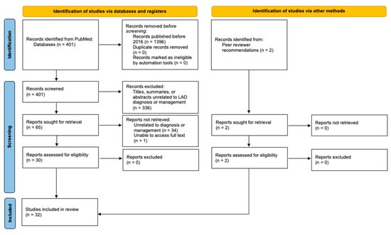 A preliminary search yielded 401 articles published between 2016 and 2021 that were related to “linear igA”. The titles, summaries, and abstracts were screened for relevance to the topic, leaving a total of 65 articles. These studies were assessed further by reading the abstract or full text. Articles without full-text access or those that were unrelated to diagnosis or management were not retrieved. This left 30 studies that met the inclusion criteria, in addition to 2 articles recommended by peer reviewers (Figure 1).