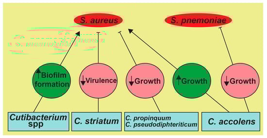 Possible microbial interactions in the UAs. The secretions of Staphylococcus lugdunesis (i.e., lugdunin, a thiazolidine) inhibits the growth of S. aureus []. Similarly, Corynebacterium spp. shifts S. aureus towards a more commensal state by attenuating its virulence components, such as the agr operon and genes involved in its hemolytic activity [,,]. Moreover, Corynebacterium and Cutibacterium spp. affect the growth of S. aureus, as the most commonly secreted porphyrin by Cutibacterium spp. facilitates S. aureus aggregation and biofilm formation with other UA microbes [,,].