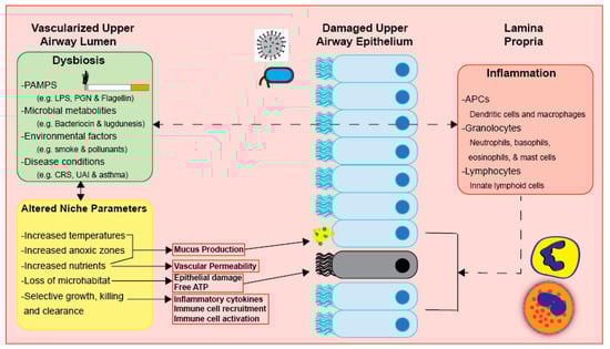 Inflammation subjects the UA microbiota to selective pressure and may lead to dysbiosis, as it causes alterations in UA niches (see Figure 3) []. Clinical features of inflammation mostly stem from increased blood flow to the afflicted region in the UAs []. Such clinical features include increased vascular permeability, which facilitates the release of materials and immune cells, as well as increased mucus secretion and mucociliary clearance []. Even though the immune response plays a beneficial and protective role, altered inflammation may also lead to further harm, such as tissue injury and edema in the UAs, as well as altered niche parameters and dysbiosis [,].