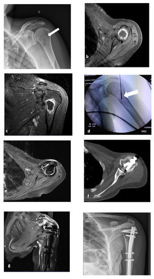 A 56-year-old female patient with a left humerus metastasis from breast cancer (a–d). Coronal X-ray shows a lytic lesion in the superior portion of the humerus (arrow). Axial and coronal T1-weighted MR scans with fat suppression after gadolinium infusion (b,c) show the lytic lesion surrounded by a rim of enhancement. The coronal C-Arm image (d) shows the MW antenna positioned in the lesion (arrow). After 1 year of follow-up, axial and coronal MRI (e–g), axial CT (f) and X-ray (h) show the presence of the endoprosthetic replacement and no local relapse in the treated site.