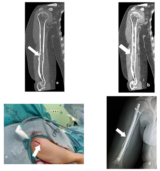 Impending fractures of the femur, tibia and humeral shaft were all treated with antegrade locking long nails. Preoperative antibiotic prophylaxis (cefazolin 2 intravenously) was infused and surgical sterile fields were prepared. The approach firstly involved creating a nail entry portal in the proximal tibia, femur and or humerus. This allowed performing the MWA procedure inside the medullary canal and, right after, fixing the impending fracture with an intramedullary device. We used the trans-deltoid with supraspinatus split approach for the humerus, infrapatellar through patellar tendon for the tibia and tip of great trochanter approach for the femur. All the procedures required the aid of a C-Arm. In each case, a guide wire was inserted through the bone shaft and when the medullary canal was narrow, reaming it was unavoidable and was made 1.5 mm larger than the nail diameter. Once the nail was inserted and the guide wire removed, we increased device stability by introducing blocking screws in multiple proximal and distal holes of the nail. An end cap was positioned at the tip of the nail; the proximal surgical wound (4–5 cm) used for the nail entry point and incisions (1–2 cm) used for screw insertion were closed in layers and secured with dressings. Antithrombotic prophylaxis was recommended for at least 30 days (Figure 2 and Figure 3). From the first day after surgery, patients were encouraged to get up from the bed and fully recover all previous functional daily autonomies without restrictions.