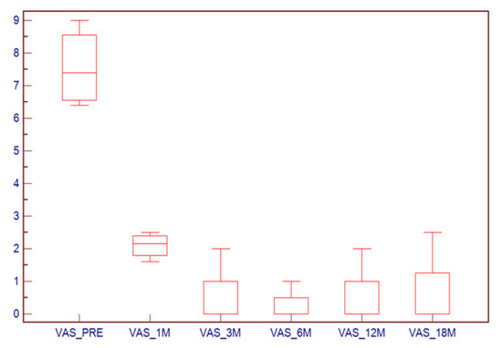 The VAS score ranged from 7 (4–9) before treatment to 1.5 (0–2.5) after treatment. Wilcoxon analysis showed a statistically significant difference before and after treatment in all the follow-up checks (p < 0.001). In Figure 4 the box-plots are given.
