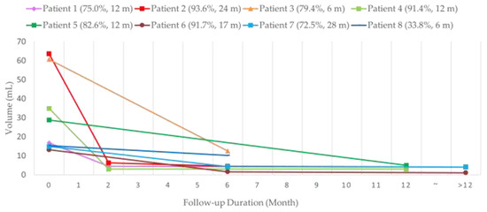 Seven patients received single-stage RFA. The mean volumes of each mass before RFA, at midterm follow-up, and at final follow-up were 33.3 ± 21.2 cm3 (range, 13.2–63.6 cm3), 5.1 ± 3.8 cm3 (range, 1.6–12.5 cm3), and 3.6 ± 1.4 cm3 (range, 1.1–5.0 cm3). There were statistically significant volume changes between baseline volumes, midterm follow-up (p = 0.020), and final follow-up (p = 0.022) after RFA. The VRR were 82.7 ± 9.4% at midterm follow-up and 84.5 ± 9.2% at final follow-up. There was also significant volume reduction for patients with vascular malformation (41.0 ± 20.4 cm3 vs. 5.8 ± 3.8 cm3, p = 0.014). As for the two patients with neurofibroma, the volumes of each mass before and after RFA were 14.1 ± 1.2 cm3 and 2.6 ± 2.1 cm3, respectively. The VRR before and after RFA for vascular malformation and neurofibroma were 84.4 ± 7.9% and 82.1 ± 13.6%, respectively. A trend chart of the mass volume is shown in Figure 1. All patients presented with a bulging lesion leading to apparent esthetic issues and pressure sensation, with cosmetic scores of 3–4 at initial evaluation. Facial asymmetry was apparent for six patients with head and neck region masses, and the patient with congenital hemangioma presented with lobular, reddish bulging mass lesion. No complaints of worsening symptoms or cosmetic problems after RFA treatment were noted during the follow-up period. Of note, there were significant improvements to cosmetic scores before and after RFA (from 3.71 to 1.57, p = 0.017). Photographs and image comparisons are shown in Figure 2 and Figure 3. The patients were followed up for a mean period of 14.6 months (range, 6–28 months). During the follow-up period, no significant regrowth of targeted masses was observed.