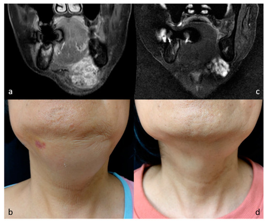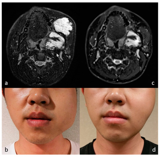 Figure 4. MR images of patient 2 before (a) and after (c) RFA show almost total volume reduction of the targeted venous malformation in the left masticator space. The lesion in the deep layer remained stable in size. Photographs before (b) and after (d) RFA show satisfactory improvement of facial asymmetry (cosmetic scale 4 → 3). Residual facial asymmetry was due to bone remodeling and deep-seated lesions.