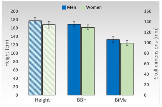 Graphical representation of the differences in average patient height and skull measurements between genders. Height is represented on the primary axis, in centimeters. Cranial diameters are represented on the secondary axis, in millimeters. Error bars represent standard deviations. BBH—height between the basion and the bregma. BiMa—bimastoid width.