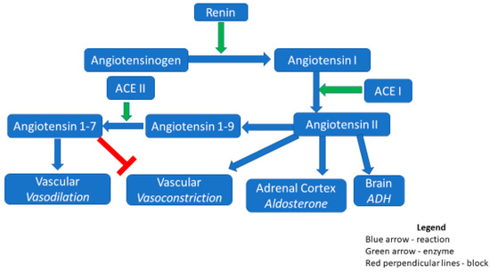 Renin–angiotensin-aldosterone system (RAS) and ACE inhibitors. The precursor molecule angiotensinogen is cleaved by renin to form angiotensin 1 in response to low sodium-chloride, as sensed by the macula densa. Angiotensin 1 is then further modified by the angiotensin-converting enzyme (ACE) to form angiotensin II. The ACE is the target of ACE inhibitors. Angiotensin II has direct effects on the vasculature, adrenal cortex, and brain, causing vasoconstriction and the secretion of aldosterone and the anti-diuretic hormone (ADH), respectively. An alternate pathway also exists, whereby angiotensin II is converted to angiotensins 1–9 and then angiotensins 1–7. A key enzyme in the formation of the latter is ACE2. Angiotensins 1–7, in contrast to angiotensin II, cause vasodilation and inhibit vasoconstriction.