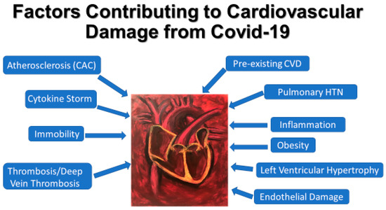 COVID-19 cardiac manifestations may include myocarditis, cardiac arrhythmias, and new or worsening heart failure, which may be particularly damaging to patients with a history of CVD [140,141]. The mechanisms underlying cardiac injury may be multifactorial (Figure 2). Inflammation and thrombosis are known culprits [142]. Infection increases overall metabolic demand and heart rate. This intensifies oxygen expenditure while shortening the filling time in the diastole and limiting coronary perfusion. Infection-mediated vasoconstriction and ventilation/perfusion mismatch negatively affecting blood oxygenation can exacerbate the oxygen deficit, leading to myocardial ischemia [143,144]. Internalized virus loads within cardiomyocytes may directly damage the heart.