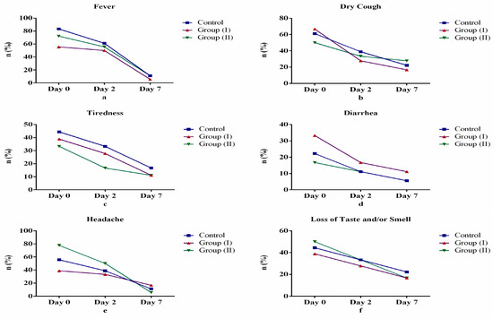 In Table 1, we show a significant decrease in the number of participants reporting clinical symptoms (fever, dry cough, diarrhea, headache, loss of sense of taste and/or smell and tiredness) between Days 0, 2 and 7 across groups (Control Group, Group I and Group II). A similar significant decrease was observed across each group but with different proportionality. This observed decrease across groups was, however, not statistically significant (p > 0.05). In Figure 1, we show that study participants revealed overall improvement in symptoms of fever, dry cough, diarrhea, tiredness, headache and sense of smell and taste. Specifically, after the seventh day (Day 7) of starting treatment, fever (Figure 1a), diarrhea (Figure 1d) and headache (Figure 1e) revealed the greatest rate of improvement among Group II participants as expected when compared with other days after starting treatment and other groups. Conversely, dry cough (Figure 1b), tiredness (Figure 1c) and loss of taste and smell (Figure 1f) did not show expected rate of improvement among study participants in Group II.