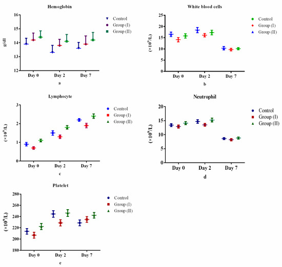Table 2 and Figure 2, Figure 3, Figure 4 and Figure 5 show the differences (both positive and negative trends) between the laboratory indices in the Control Group and treatment Group II (serum hemoglobin, total white cell count, lymphocytes, neutrophils, platelets, albumin, total bilirubin, alanine aminotransferase, aspartate aminotransferase, prothrombin time, partial thromboplastin time, serum urea, serum creatinine, C-reactive protein, serum ferritin and lactate dehydrogenase). These differences were particularly obvious on the seventh day (Day 7) after starting treatment. For example, lymphocyte count increased by 6.0% and 4.4% for Days 2 and 7 after starting treatment. Conversely, the observed differences between Control Group and treatment Group I were equivocal. However, none of these differences were statistically significant (p > 0.05).