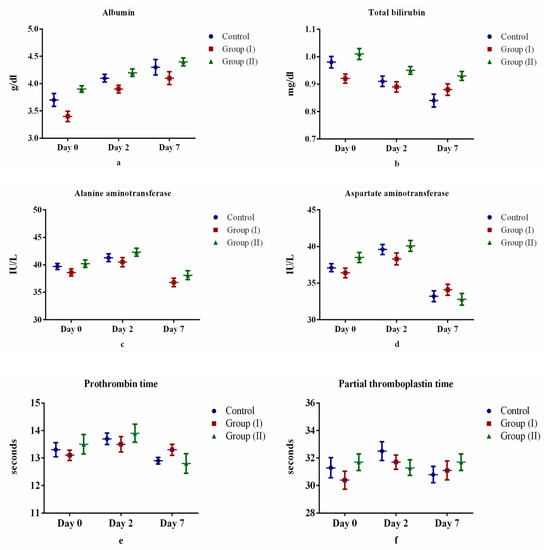 Comparison of liver function tests between control and treatment groups: (a) albumin, (b) total bilirubin, (c) alanine aminotransferase, (d) aspartate aminotransferase, (e) prothrombin time, (f) partial thromboplastin time.