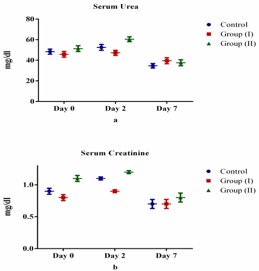Comparison of kidney function tests between control and treatment groups: (a) urea, (b) creatinine.