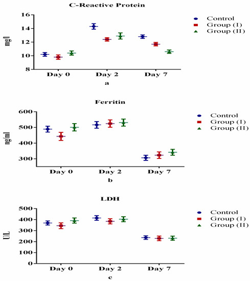 Comparison of acute inflammatory markers between control and treatment groups: (a) C-reactive protein, (b) ferritin, (c) lactate dehydrogenase.