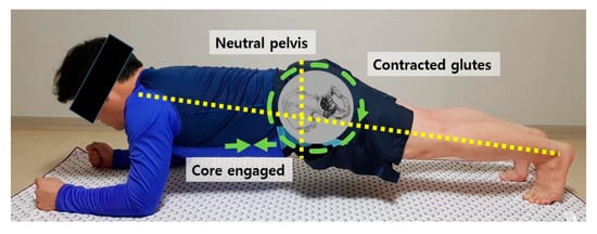Elbow plank exercise was performed for the study. Lying stretches were performed for 5 min before and after the plank exercise. In the work-out phase, the participant maintained a straight, strong line from head to toes with no lowering of the hips with the shoulders and elbows flexed at 90°, as shown in Figure 1.