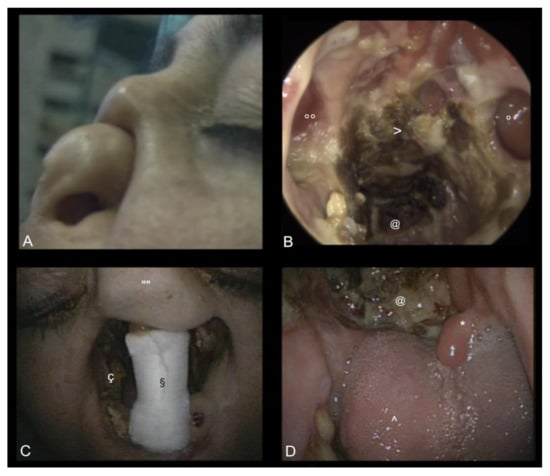 The picture shows the extent of cocaine-induced damage to the nasal dorsum (A), columella (C, §), and superior lip (C; ç indicates erosion of the piriform aperture; “” marks the remaining nasal dorsum). Pictures (B,D) show the endoscopic endonasal view of the oro-nasal cavity of the case illustrated in picture (C), which shows the total erosion of nasal septum, inferior, middle, and superior conchas, hard palate, sub-total erosion of soft palate (* shows the remaining uvula), exposure of the skull base (@ and >), as well as opening of the maxillary sinuses (° and °°).