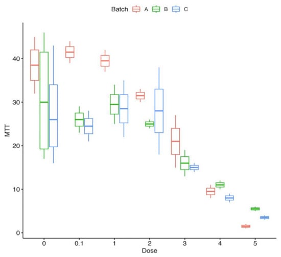 Effect of cocaine on cell growth. The boxplot shows the cell vitality, measured by 3-(4,5-dimethylthiazol-2-yl)-2,5-diphenyltetrazolium bromide (MTT), at increasing dosage of cocaine. We present data for three experiments, each in triplicate (A, B, and C).
