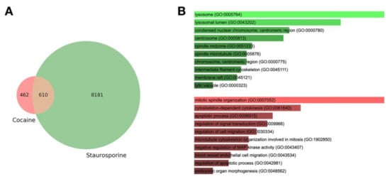 (A) Differentially expressed genes upon cocaine administration. The Venn diagram shows the number of genes that are regulated at increasing dose of cocaine or staurosporine. Genes were selected at q < 1 × 10−3; out of 1072 genes, only 462 were found specific for cocaine. (B) Gene Ontology analysis. The bar chart shows the top 10 GO:BP (gene ontology:biological process) categories enriched for the genes specifically induced by cocaine. A large fraction of terms is related to apoptosis.