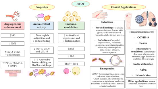 Summary of top properties of HBOT and its clinical applications. Firstly, it can provide an angiogenesis enhancement, observed by the prime production of NO which subsequently brings an upregulation of Nrf2 and growth factors like epidermal growth factor (EGF), vascular endothelial growth factor (VEGF) and endothelin-1. TNF-α, matrix metallopeptidase 9 (MMP-9) and tissue inhibitor of metalloproteinase-1 (TIMP-1) will be boosted too. Secondly, the antimicrobial activity is visible due to bacterial killing by O2, removing biofilm and lessening white blood cells (WBCs) rolling and neutrophils recruitment, hence promoting a downregulation of proinflammatory cytokines (TNF-α, IL-6 and IL-10). The immunomodulation properties are observed by a downregulation of transcriptional factor NFkB, involving a proinflammatory response switch off (IL-6) and a polarization from Th17 lymphocytes to Treg. Summarized applications include: indications for which HBOT is approved (mostly wound healing and infections), primary emergencies (like CO/CN poisoning or air embolism), and translational research (comprising COVID-19, cancer, inflammatory conditions or aging among others).