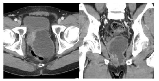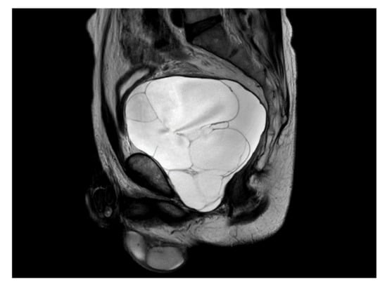 CT and MRI of giant multilocular prostatic cystadenomas demonstrate the cystic nature of the lesions, which are of various sizes, with multiple septa compressing the bladder and rectum, and without invasive large solid enhancing component [,,]. With the development of the MRI technique, it is now possible to clarify the exact boundaries of lesions and whether or not they invade surrounding organs, which is helpful in determining the treatment method and pre-surgical planning [].